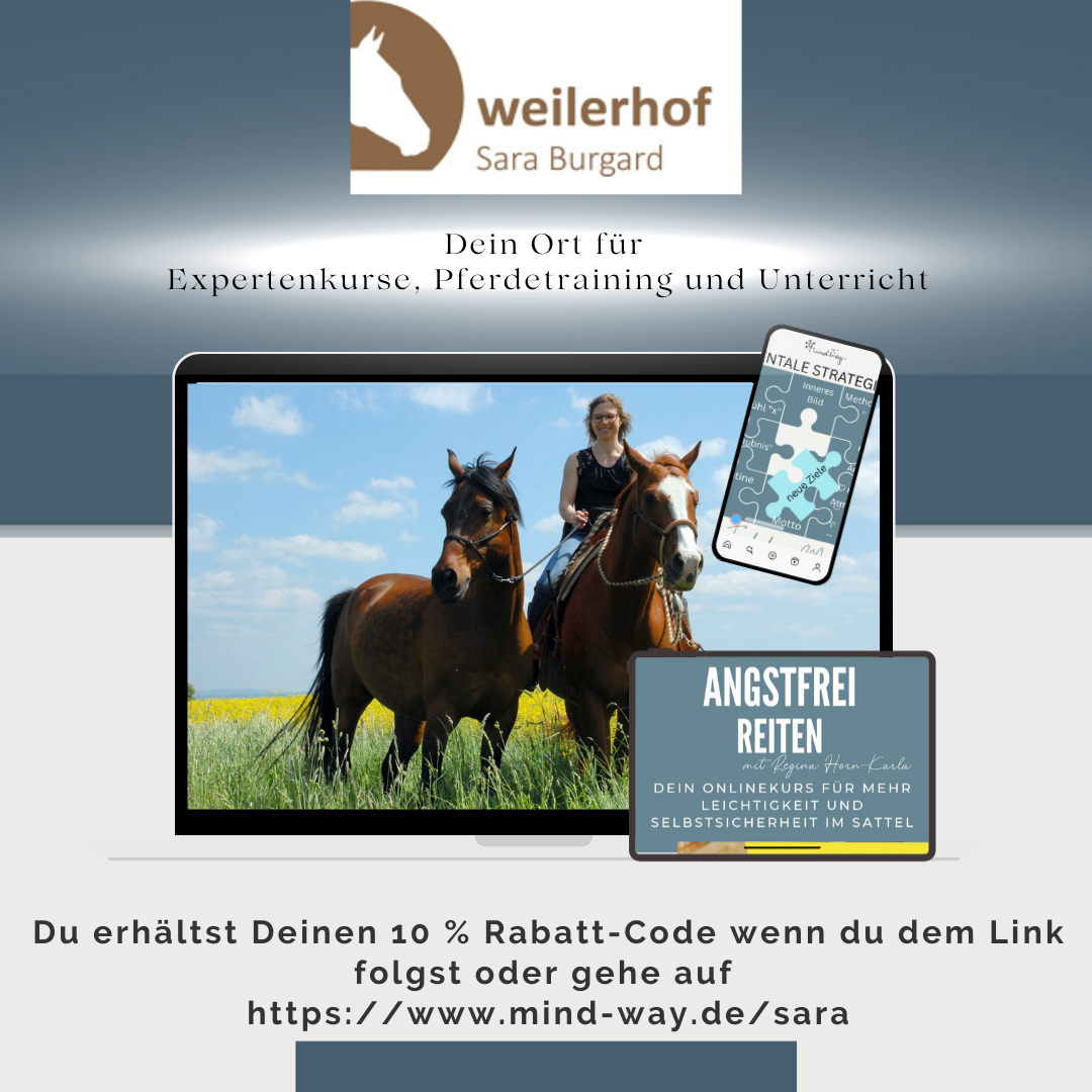 Hey, hier ist Sara vom Weilerhof. Du bist hier auf meiner Kooperationsseite mit Regina Horn-Karla gelandet. Über diese Seite erhältst du alle wichtigen Infos zum Online-Kurs "Angstfrei Reiten". Regina ist seit über 11 Jahren anerkannte Mentaltrainerin für Reiter und ich empfehle dir diesen Kurs aus vollster Überzeugung! Ich selbst arbeite seit 2018 mit Regina in Form von Kursen und Coachings auf dem Weilerhof zusammen. Die unzähligen Erfolge und Teilnehmerfeedbacks sprechen für sich. Dies ist kein Onlinekurs von der Stange, sondern ein individuell konzipierter Kurs, der dich wirklich weiterbringen wird.